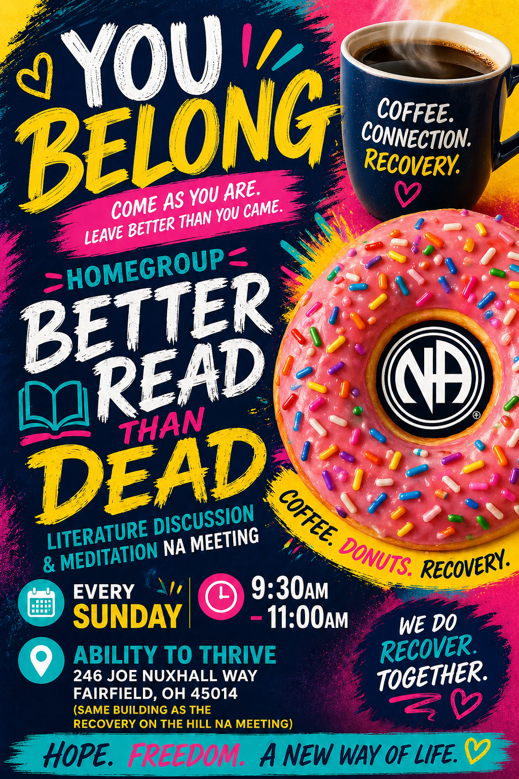 Tuesday May 5, 6pm, 2860 Mack Road, Fairfield Ohio, Speakers, Food, Clean Time Countdown, Fellowship…
